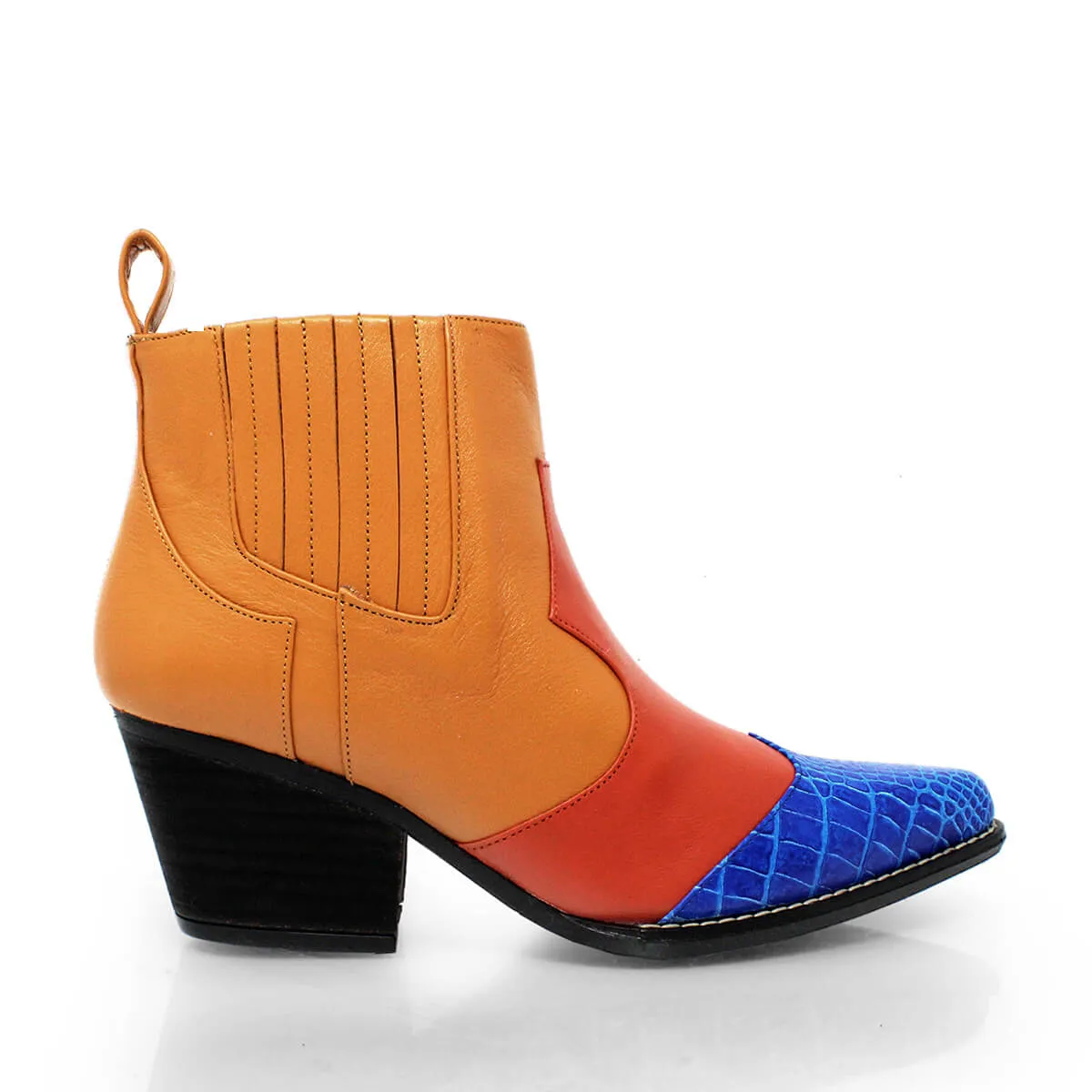 MADDIE 60 Edicion Limitada - Naranja y Azul Romero Zapato Bota Botin Tacon Bajo para Dama en Piel